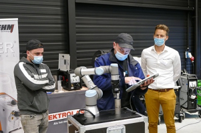 Drie enthousiaste mannen vertelden maar wat graag over hun ervaring met de cobot. Paul Cieraad Thije van Delft van Elektrolas. Samen steken zij ook heel wat uurtjes in het werken met de cobot. Voor de vraagstukken van klanten van Elektrolas creëren zij de juiste toepassing. Het voordeel wat de cobot van Elektrolas bijvoorbeeld heeft, is dat de Freedrive (die normaal gesproken op het teachpannel zit) hier in de toortsschakelaar is verwerkt. Hierdoor is het voor de lasser veel gemakkelijker de cobot in de juiste posities te zetten tijdens het programmeren. Daarnaast meten ze bij Elektrolas met kracht in plaats van met spanning. Omdat het veel minder gevoelig is voor fouten. Het verhaal van Paul en Thije werd vandaag ondersteund door Mark Roefs van JWM Metaalservice die het bewijs vormt dat de cobot alleen een succes wordt als degene die er mee moet werken hierover enthousiast is.